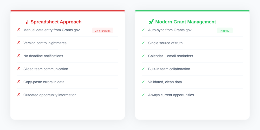 Manual data entry eating up hours. Most teams I've spoken with spend 2-4 hours per week just copying grant information from Grants.gov into their tracking sheets. That's time they're not spending on actual proposal development or relationship building. And every manual entry is an opportunity for typos and missed details.